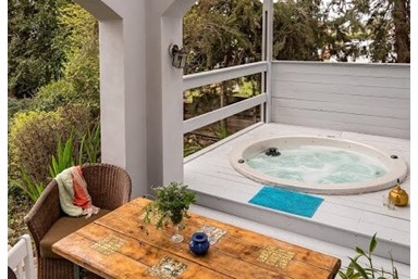 לסוויטת בית הזית יציאה למרפסת פרטית וקסומה הצופה לבוסתן ובה פינת ישיבה וג'קוזי ספא חמים ומרגיע.