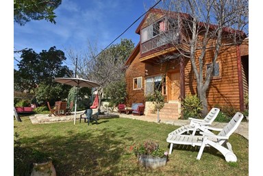 בקתת עץ חמימה עם ריהוט עץ איכותי וכל האבזור הדרוש להנאתכם המירבית: חדר השינה נמצא בקומה העליונה ובו מיטה זוגית ענקית עם מצעים מלטפים אל מול מסך lcd בלווין ומרפסת שמש עם ג'קוזי זרמים מפנק.