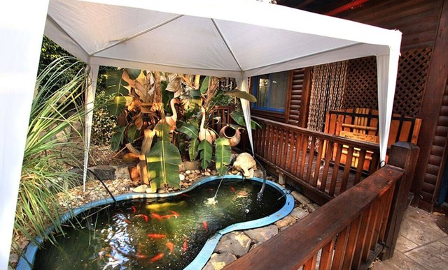 בחצר המתחם מחכה לכם דק עץ ובמרכזו בריכה נעימה וצלולה, שתרענן לכם את ימי הקיץ. לרשותכם מדשאות ירוקות ורחבות עם צמחיה עשירה, בריכת דגי נוי, מיטות שיזוף ופינות ישיבה נעימות מול הנוף.